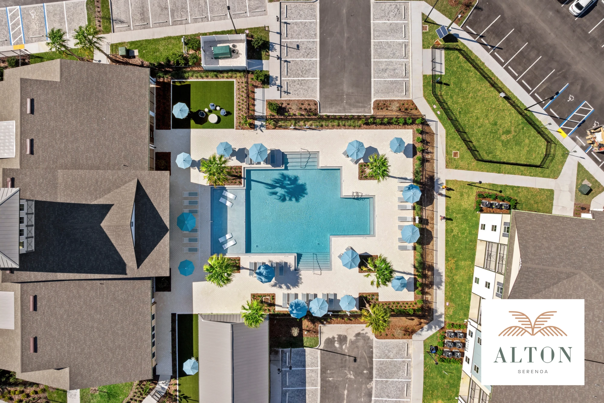 Photograph showing aerial view of community pool with umbrellas and surrounding buildings at the Alton Serenoa apartment community.